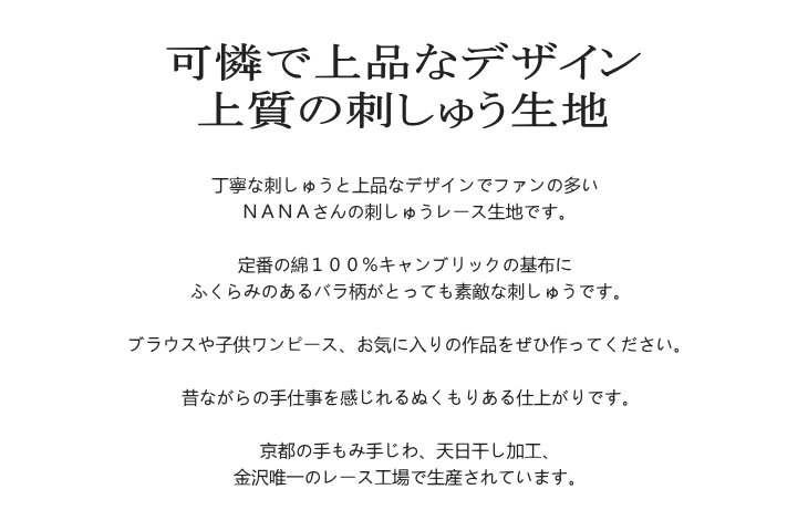 ◆素材 綿 100%............................. ◆生地巾 約110cm幅/刺しゅう幅約102cm(手もみしわのため誤差あり) ............................. ◆日本製(刺しゅうは金沢) ............................. ◆天日干し 手もみワッシャー ............................. ◆土台生地 キャンブリック ............................. ◆ 生地の厚みは普通 ............................. ◆適しているミシン糸 60番手 ............................. ◆適しているミシン針 11号 ............................. ▼製作後にゆがみが出ないように 水通しして布目を整えてからお使いくださいね。