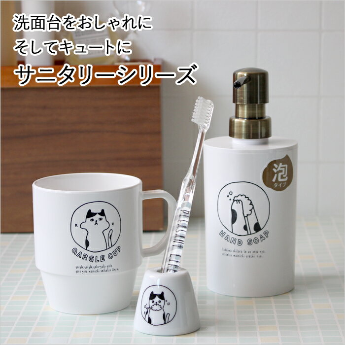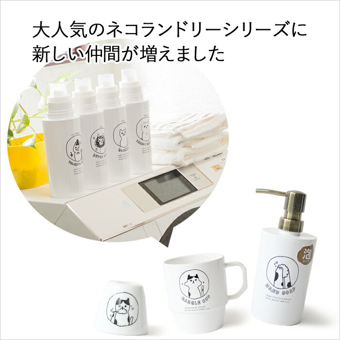 ネコサニタリー シリーズ3点セット歯ブラシホルダー+コップ+ハンドソープディスペンサー(泡タイプ) 手書き風の可愛らしいネコのイラストが描かれた人気のお洗濯洗剤用の詰替え ボトルシリーズに、サニタリーで使えるアイテムが登場しました。
