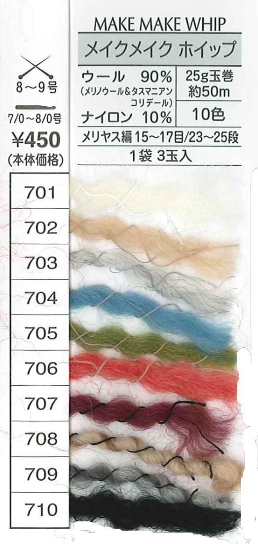 重さ:25g糸長:約50m太さ:棒針8〜9号、かぎ針7/0〜8/0素材:ウール 90%、ナイロン 10%その他:メリヤス編標準ゲージ15〜17目23〜25段婦人プルオーバー 約15玉、婦人ベスト 約10玉紳士プルオーバー 約20玉、紳士ベスト 約12玉シンプルな編地でもノットが面白い表情をだし、魅力的な作品に仕上がります。