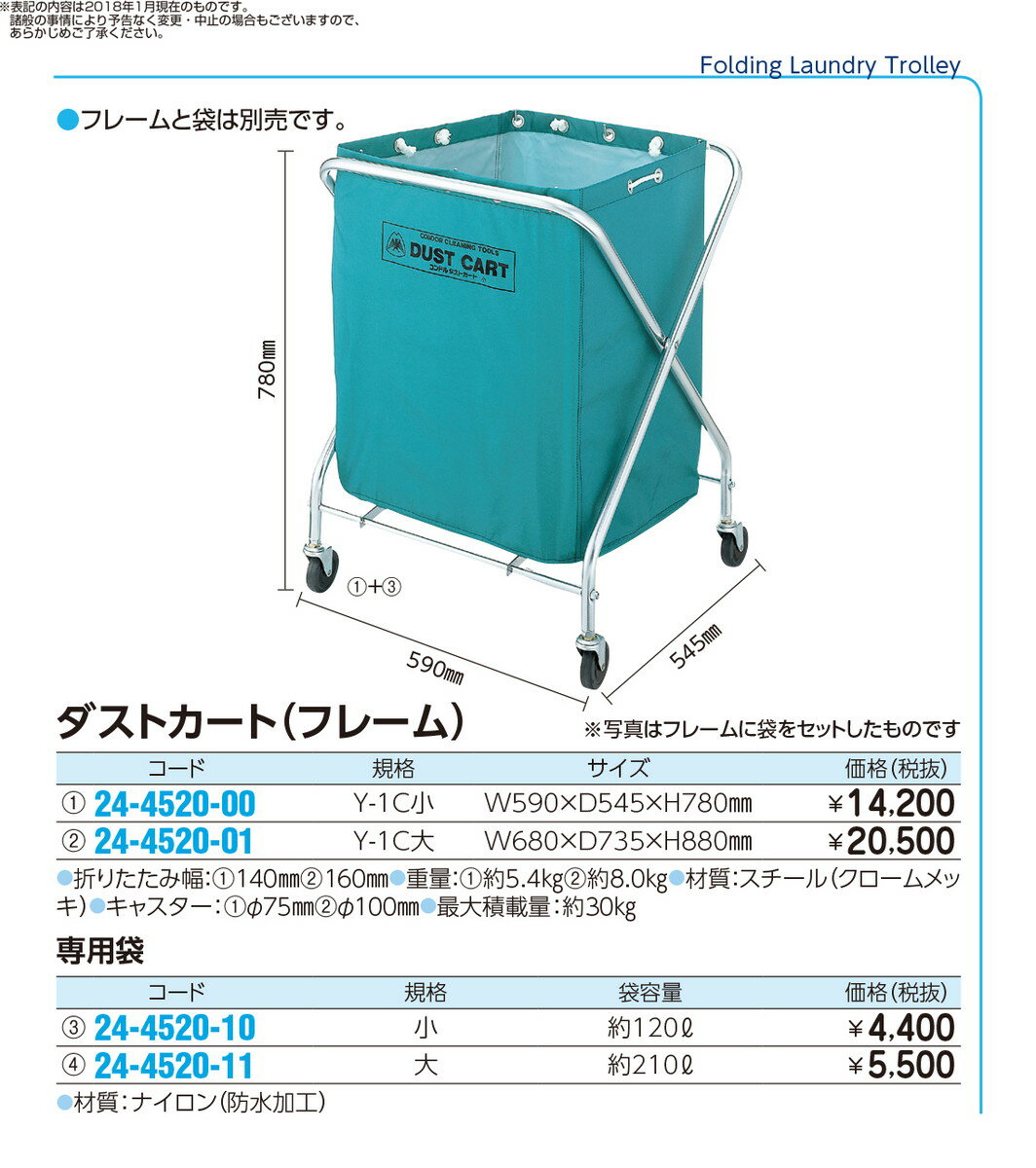 ダストカートY−1C(フレーム)大 CA394-00LX-MB(クローム)品番 24-4520-011入り 医療機器対象外 ワゴン・カート ランドリーカート・ダストカート 定価\20500 JAN 4903180411740 ●定価¥20,500円(税別)●商品説明●フレームと袋は別売です。