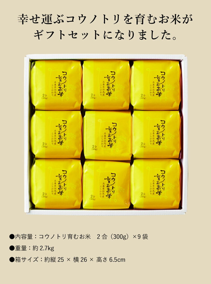 新米 幸せを運ぶ鳥 コウノトリ 食べる健康!食べる貢献!生命を育むお米 コウノトリ育むお米 減農薬 無化学肥料 かわいい キューブ300g×9個セット 贈答 ギフト 結婚 出産 内祝い 合格 2年産 幸運 祈願 米