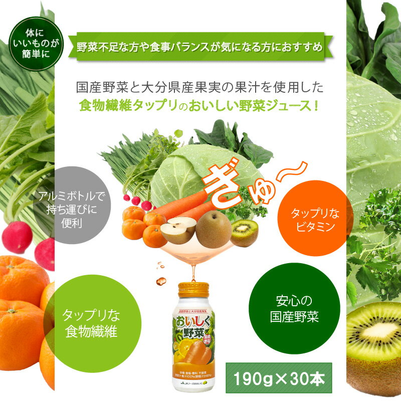 特産品説明名称【ふるさと納税】大分産おいしく野菜 190g×30本 I02057【大分県大分市】内容量190g×30本賞味期限570日配送温度帯常温説明国産野菜と大分県産果実の果汁を使用した野菜ジュースです。